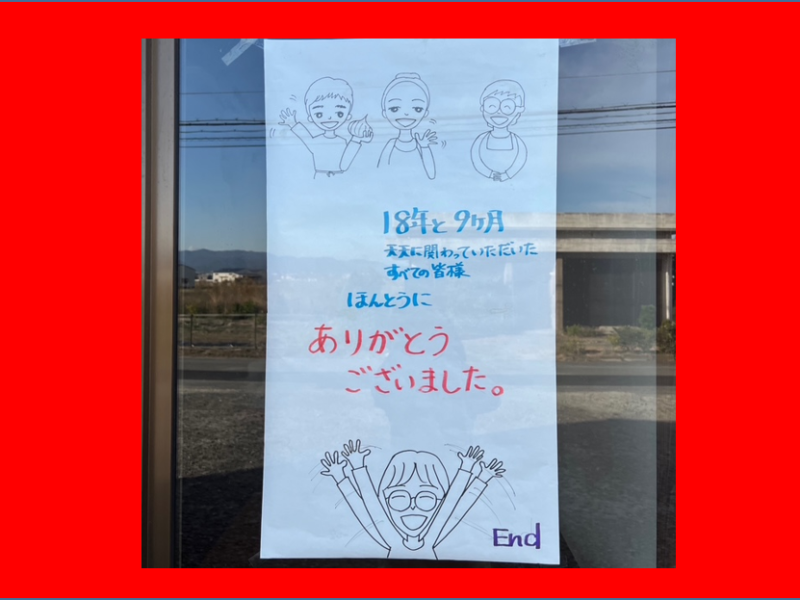 続きを読む平素よりご愛顧いただき誠にありがとうございます。このたび本年12月をもちまして、天天は閉店させていただくこととなりました。 常連のお客様、地域の皆様には色々なお言葉、笑顔に励まされ、また未熟な部分も暖 …
